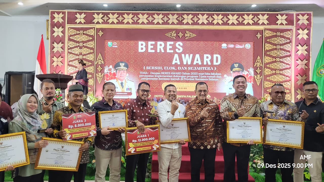 Penghargaan prestisius yang digelar oleh Dinas Perumahan dan Kawasan Permukiman (Perkim) Sumsel ini berlangsung meriah di Ballroom Hotel Swarna Dwipa Palembang, Selasa malam (9/12/2025). BERES Award dikenal sebagai barometer penilaian kualitas kawasan permukiman berbasis 7 indikator kumuh, sehingga predikat juara bukanlah capaian biasa—melainkan bukti nyata keberhasilan desa dalam tata kelola lingkungan dan pemberdayaan masyarakat.