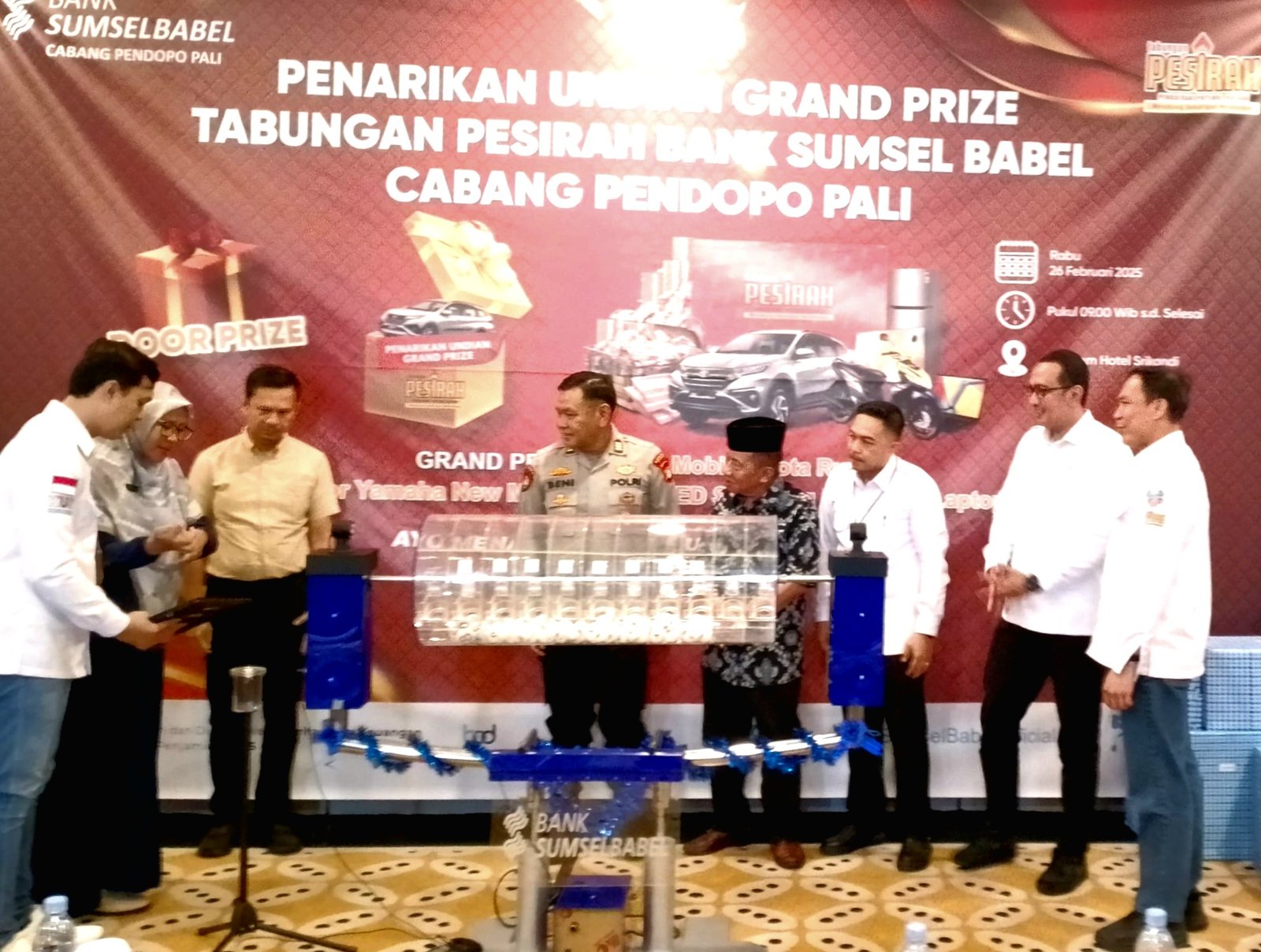 Sebagai bentuk apresiasi kepada nasabah setia, Bank Sumselbabel Cabang Pendopo menghadirkan beragam hadiah menarik dalam undian tahun ini. Hadiah utama berupa super grand prize senilai jutaan rupiah sukses menjadi daya tarik utama bagi para peserta. Selain itu, berbagai hadiah bergengsi lainnya juga dibagikan, di antaranya, 1 unit mobil Toyota Rush, 2 unit sepeda motor Yamaha Mio, 1 unit televisi Samsung, 1 unit kompor gas, Beberapa unit kipas angin, Serta berbagai hadiah menarik lainnya