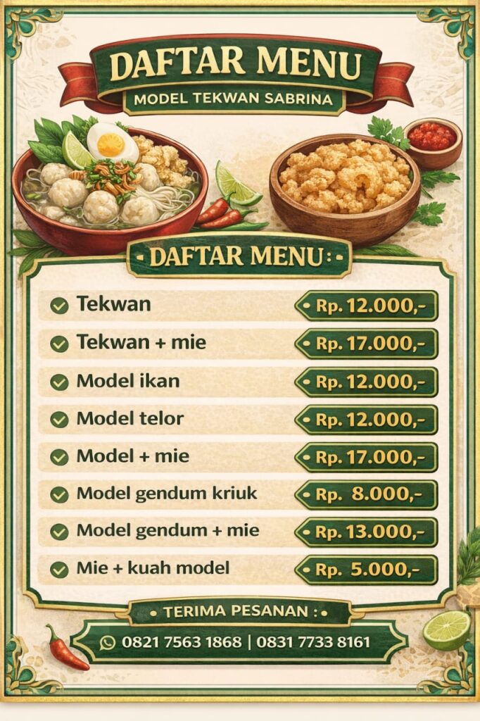 Bagi para pemburu kuliner lokal, Model Tekwan “Sabrina” layak masuk dalam daftar wajib kunjung. Tak hanya memanjakan lidah, tempat ini juga menghadirkan kehangatan rasa dan suasana khas Palembang. Kedai ini juga melayani pesanan melalui WhatsApp di 0821 7563 1868 atau 0831 7733 8161.