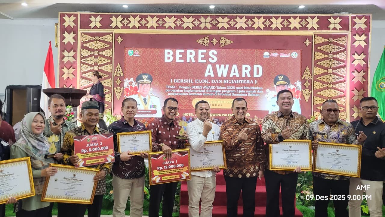 Penghargaan prestisius yang digelar oleh Dinas Perumahan dan Kawasan Permukiman (Perkim) Sumsel ini berlangsung meriah di Ballroom Hotel Swarna Dwipa Palembang, Selasa malam (9/12/2025). BERES Award dikenal sebagai barometer penilaian kualitas kawasan permukiman berbasis 7 indikator kumuh, sehingga predikat juara bukanlah capaian biasa—melainkan bukti nyata keberhasilan desa dalam tata kelola lingkungan dan pemberdayaan masyarakat.