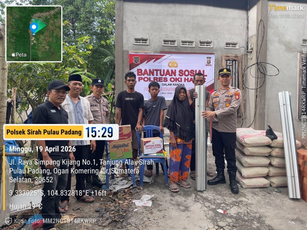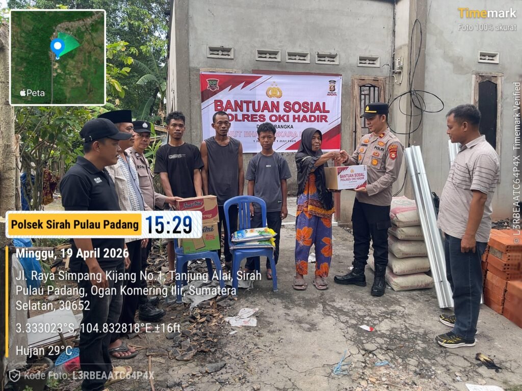 SP Padang, Wartasumselbabel.com – Di tengah duka akibat kebakaran yang melanda rumahnya, Mala Dewi, warga Desa Tanjung Alai, Kecamatan SP Padang, mendapat uluran tangan dari jajaran kepolisian. Bantuan itu datang dari Polsek SP Padang Polres OKI dalam rangka memperingati Hari Bhayangkara ke-80, Minggu (19/4/2026).