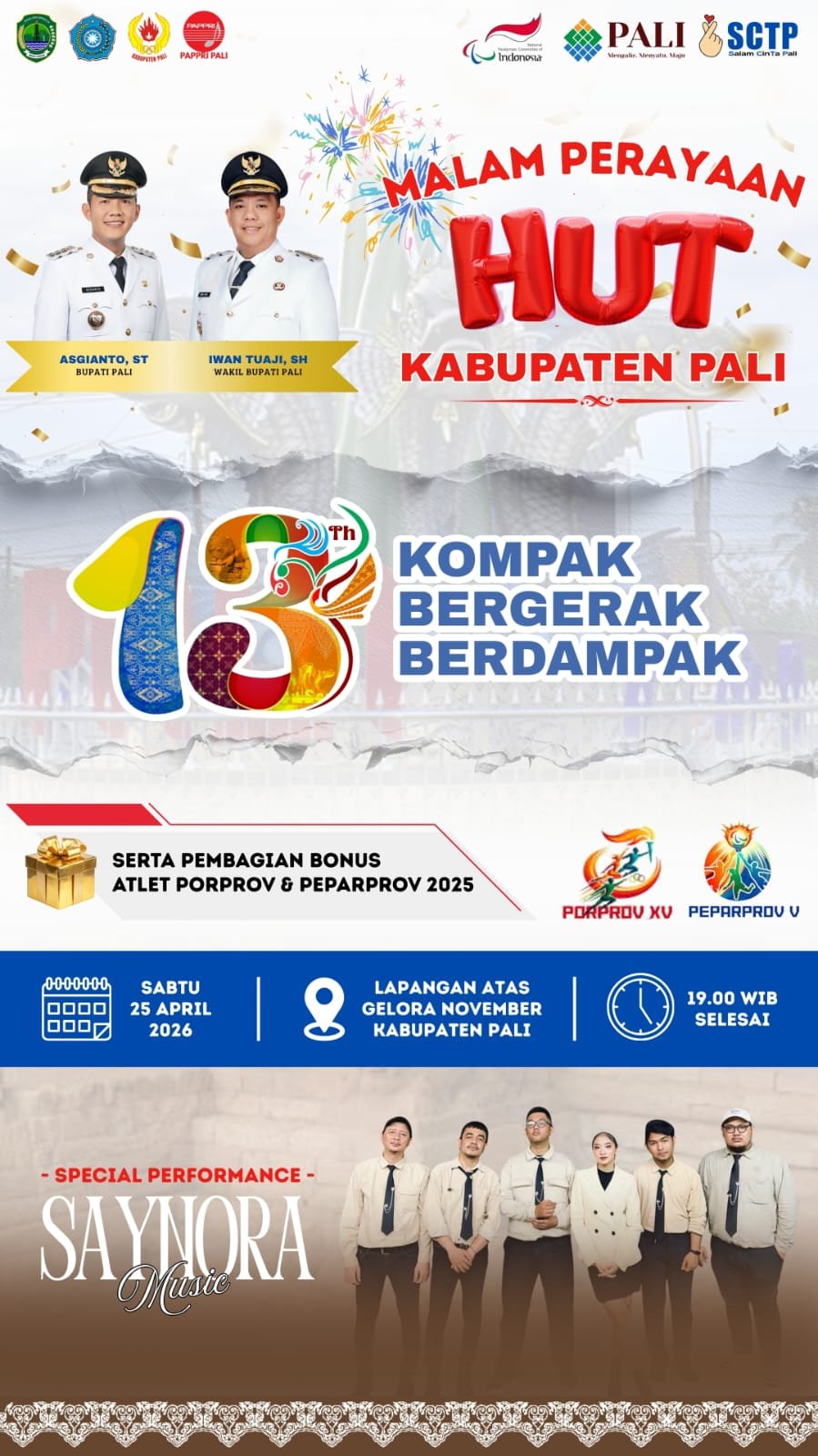 “Momentum HUT ke-13 ini bukan sekadar perayaan, tetapi menjadi refleksi perjalanan pembangunan Kabupaten PALI. Saya mengajak seluruh masyarakat untuk hadir, bersatu, dan bersama-sama memeriahkan malam perayaan ini. Dengan semangat kompak bergerak berdampak, kita kuatkan kebersamaan demi PALI yang lebih maju, sejahtera, dan berkelanjutan,” ujar Bupati.