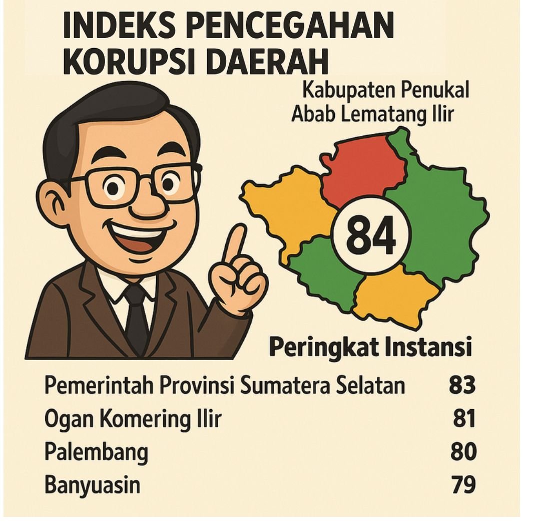 PALI | WaetasumselBabel.com — Kabupaten Penukal Abab Lematang Ilir (PALI) kembali menorehkan prestasi membanggakan dalam tata kelola pemerintahan. Berdasarkan pembaruan data resmi Indeks Pencegahan Korupsi Daerah (MCP) 2025 yang dirilis melalui portal Jaga KPK pada 9 Desember 2025, PALI mencatatkan skor 83,9 dan berhasil meraih peringkat pertama di Provinsi Sumatera Selatan.