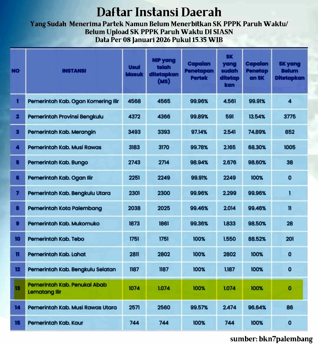 “Kami mengucapkan terima kasih kepada Badan Kepegawaian Negara, khususnya Kantor Regional VII Palembang, serta seluruh perangkat daerah di lingkungan Pemerintah Kabupaten PALI yang telah bekerja sama secara maksimal. Alhamdulillah, seluruh usulan NIP dan SK PPPK Paruh Waktu Tahun 2025 dapat diselesaikan dengan baik dan tepat waktu,” ungkap Imansyah.