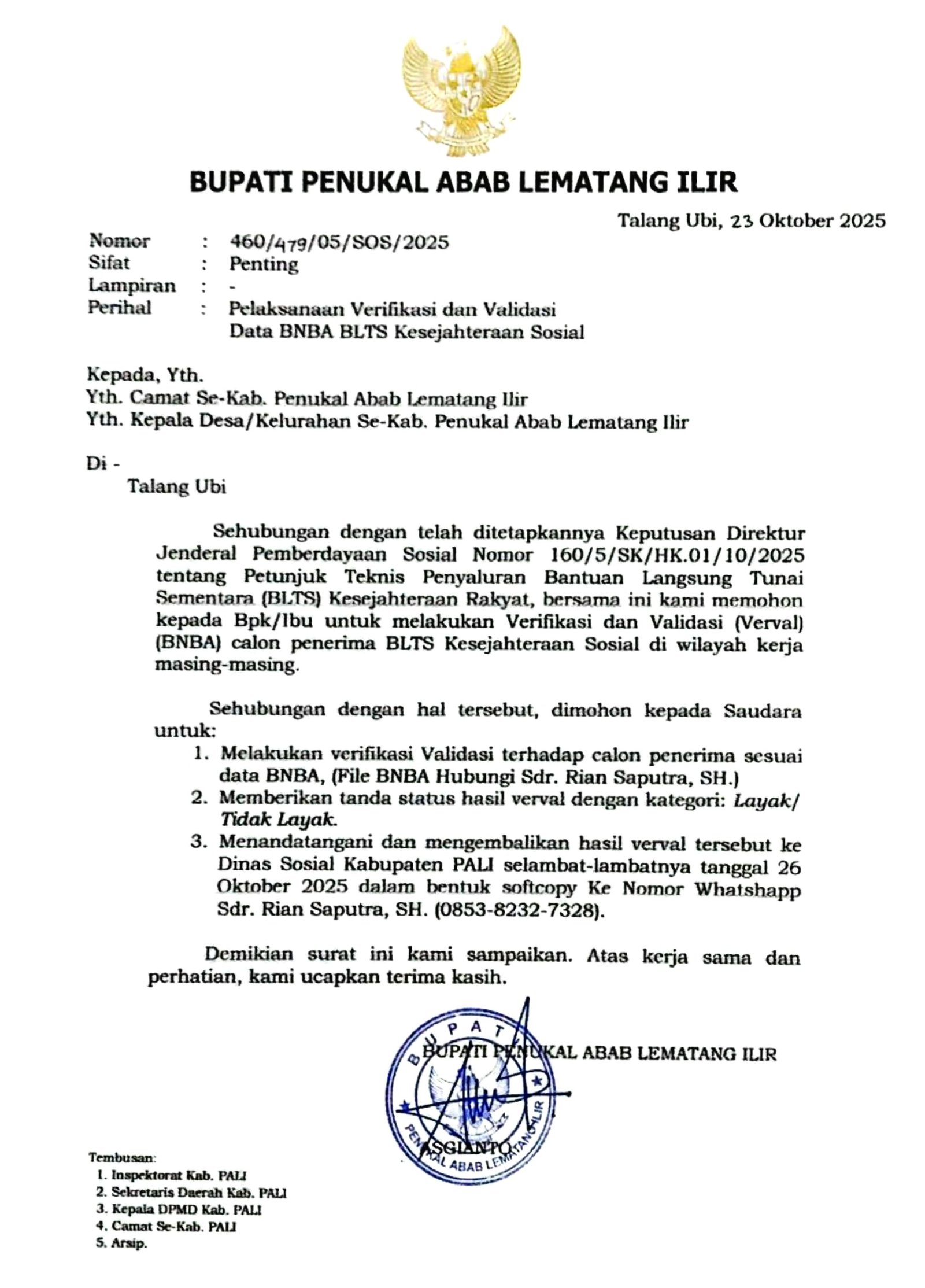 Ironisnya, persoalan ini terjadi meski Bupati PALI Asgianto telah mengeluarkan instruksi tegas melalui Surat Resmi Nomor 460/479/05/SOS/2025 tertanggal 23 Oktober 2025 tentang Pelaksanaan Verifikasi dan Validasi Data BNBA BLTS Kesejahteraan Sosial. Dalam surat tersebut, seluruh camat, lurah, dan kepala desa diwajibkan melakukan verifikasi dan validasi (verval) terhadap calon penerima bansos, menetapkan status layak atau tidak layak, serta menandatangani surat pertanggungjawaban atas hasil pendataan di wilayah masing-masing.